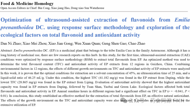 响应面法优化小一点红总黄酮的提取工艺,探讨生态因子对其总黄酮和抗氧化活性的影响