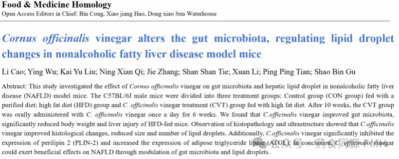 山茱萸果醋改变非酒精性脂肪性肝病模型小鼠的肠道微生物群调节脂滴变化