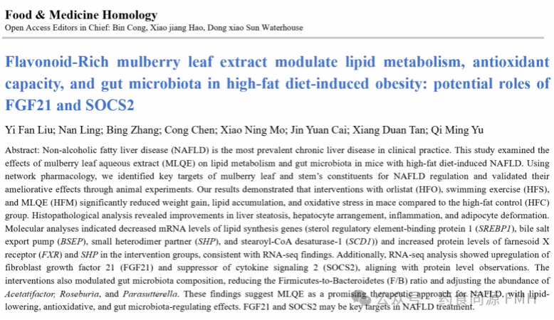 桑叶水提取物在调节非酒精性脂肪肝脂质代谢与抗氧化应激潜力的研究
