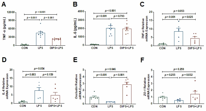 DIPS 通过调控促炎细胞因子平衡及修复肠道屏障功能发挥抗炎作用: DIPS干预使 LPS 诱导的 TNF-α 水平显著降低 50%(从 4453.04 pg/mL 降至 2226.52 pg/mL);同时,DIPS 可显著上调紧密连接蛋白 Occludin(9.86 倍)和 ZO-1(2.69 倍)的 mRNA 表达,修复 LPS 破坏的肠道黏膜屏障结构。分子机制上,DIPS 通过抑制 TNF-α/IL-6 通路减少炎症细胞浸润,并通过增强紧密连接蛋白表达维持肠上皮完整性。