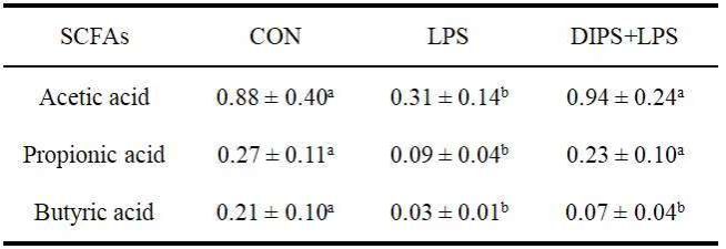 表1. DIPS 干预对 LPS 诱导炎症小鼠肠道内容物SCFAs代谢的影响(mg/g)