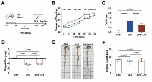 DIPS 对 LPS 诱导的小鼠炎症反应的影响如图2所示。整体来看,DIPS 对炎症反应具有显著保护作用:DIPS+LPS 组小鼠体重在喂养过程中始终显著高于其他两组(图2B),这可能与 DIPS 促进机体营养吸收有关;LPS 注射后小鼠疾病活动指数(DAI)显著升高,但 DIPS 干预组 DAI 较 LPS 组显著降低(图 2C)。此外,与 LPS 组相比,DIPS 干预组小鼠炎症症状(图 2D-1F)明显减轻,值得注意的是 DIPS 显著改善了 LPS 诱导的小鼠结肠缩短现象。上述结果表明 DIPS 在缓解肠道炎症症状中具有重要作用。
