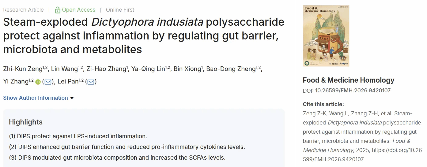 多糖作为食物中重要的生物活性成分,可通过促进益生菌增殖及产生短链脂肪酸来发挥抗炎作用。竹荪(Dictyophora indusiata)是一种富含碳水化合物、蛋白质等营养素的食用菌,其多糖具有抗氧化、抗炎及抗肿瘤等多种生物活性,但传统提取方法存在多糖得率低的技术瓶颈。蒸汽爆破预处理技术通过高压蒸汽分解原料结构,可有效提高目标物质的提取率及生物活性。我们研究发现,采用蒸汽爆破预处理技术可使竹荪多糖(DIPS)提取率较传统热水法提高 2.46 倍。