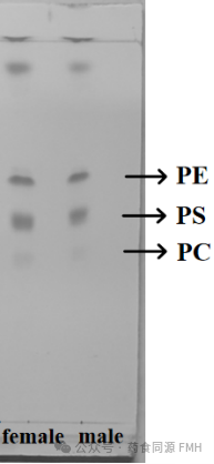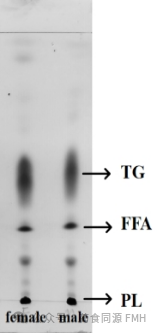 采用薄层色谱法(TLC)对雄性与雌性紫贻贝的总脂样品进行分离。根据不同脂质组分的极性差异,其在薄层板上的迁移距离亦不相同,最终在色谱板上形成清晰的条带,自上而下依次为甘油三酯(TG)、游离脂肪酸(FFA)和磷脂(PL)。