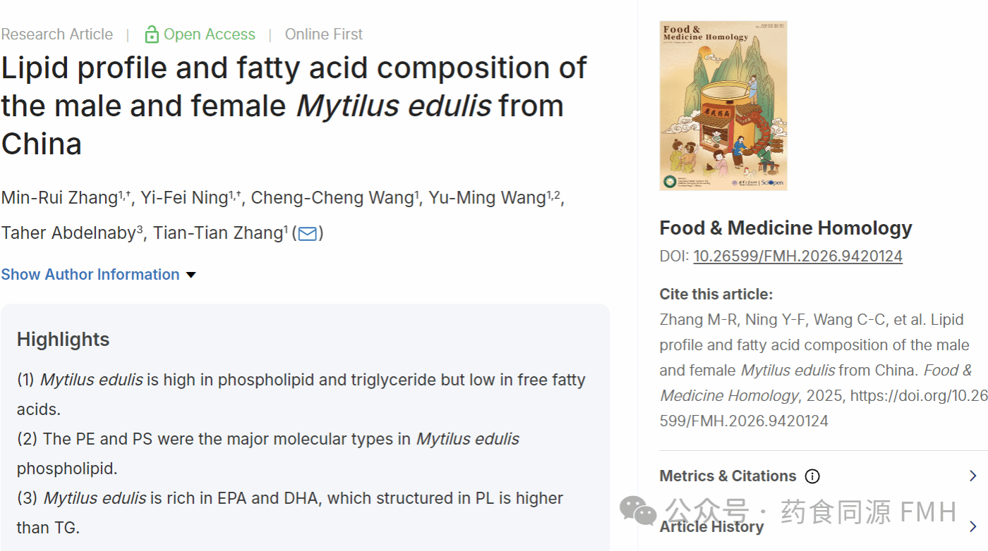 研究表明,贻贝富含对健康有益且营养价值高的n-3多不饱和脂肪酸(n-3 PUFAs),如二十碳五烯酸(EPA,C20:5n-3)和二十二碳六烯酸(DHA,C22:6n-3),这些脂肪酸的含量受摄入微藻的种类和生长地点的影响。研究表明,贻贝的脂质提取物具有良好的抗炎、降血压、调节血糖、降低血脂等功效。贻贝大多为雌雄异体,在非繁殖季节没有显著差异,但在繁殖季节,由于生殖腺的不同,雌性呈现橙色或黄色,而雄性则呈现乳白色。然而目前尚无关于雄性和雌性贻贝的脂质组成和脂肪酸谱的比较信息。