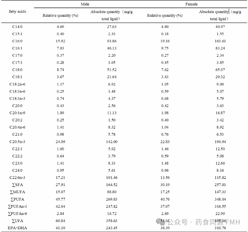 表1 雌、雄紫贻贝总脂质中脂肪酸组成