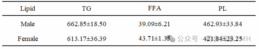 雄性紫贻贝的总脂质中甘油三酯(TG)含量为662.85mg/g,雌性为613.17 mg/g,雄性较雌性高8.10%。游离脂肪酸(FFA)在雄性中含量为39.09 mg/g,雌性为43.71 mg/g,雌性显著高于雄性11.82%。磷脂(PL)在雄性中含量为462.93 mg/g,雌性为421.84 mg/g,雄性比雌性高9.74%。T检验结果表明,雄性与雌性紫贻贝在甘油三酯、游离脂肪酸及磷脂含量方面均无统计学显著差异。