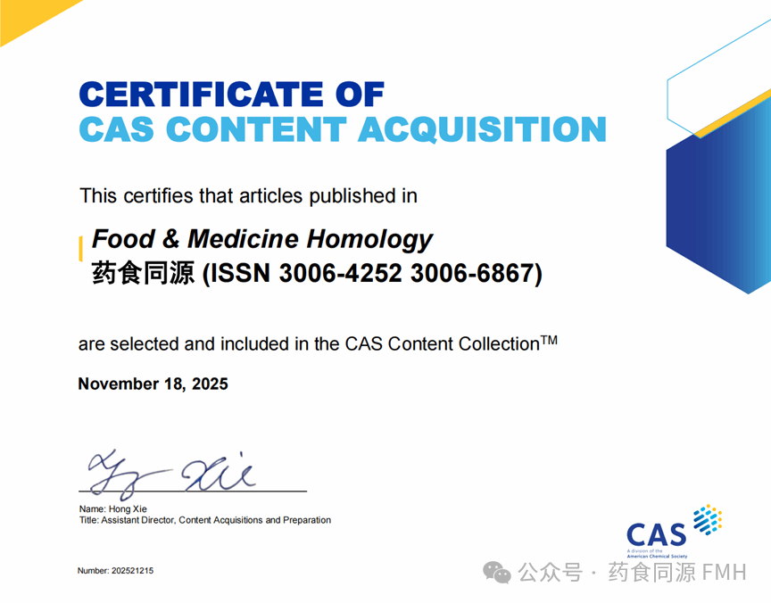 近悉,经美国化学文摘来源索引(CAS Source Index,CASSI)平台确认,Food & Medicine Homology已正式被美国化学文摘(CAS)收录。