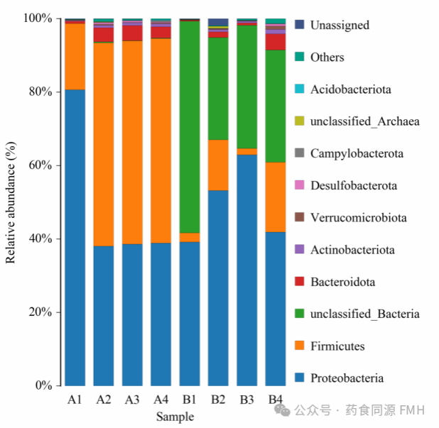 以27F/1492R为通用引物,对虾池海蚯蚓肠道和滩涂海蚯蚓肠道样品的16S rDNA基因进行全长扩增,利用 PacBio 测序平台进行测序。结果显示,虾池蚯蚓肠道样品中占主导地位的菌门为Proteobacteria (49.048%)、Firmicutes (46.125%)和Bacteroidota (2.904%)。滩涂海蚯蚓肠道样品中占主导地位的菌门为Proteobacteria (49.298%)、Firmicutes (9.282%)和unclassified_Bacteria (37.395%)(图1)。虾池海蚯蚓肠道样品中占主导地位的菌属为Escherichia_Shigella(10.978%)、Klebsiella(8.850%)和Roseibium(9.104%)。滩涂海蚯蚓肠道样品中占主导地位的菌属为unclassified_Gammaproteobacteria(43.136%)、unclassified_Bacteria(37.395%)和Achromobacter(1.305%)(图2)。揭示了海蚯蚓所处地域环境,是影响海蚯蚓的肠道微生物的重要因素。
