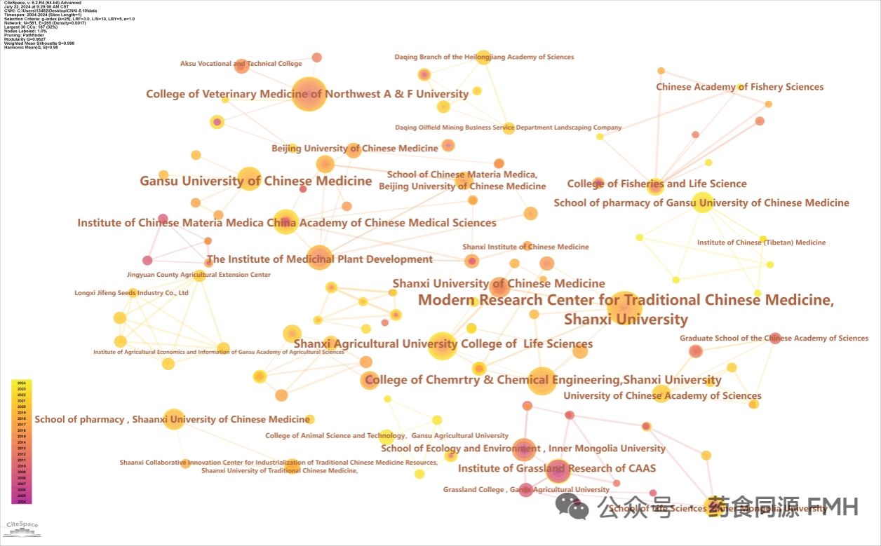 从机构共现图中,我们可以观察到N=581,E=309(密度=0.0018),其中N 表示节点数,E 表示连接数,密度表示网络密度。这表明网络图包括 581 个机构,有 309 个合作关系,网络密度为 0.0018(图 3)。西北农林科技大学兽医学院与内蒙古、青海、新疆等地的高校/机构有合作关系;山西大学现代中药研究中心与山西高校、中国医学科学院药用植物研究所、北京协和医学院等有合作关系。综上所述,甘肃和内蒙古的大学之间、山西和北京的研究机构之间都有机构间合作。其他合作主要发生在医科大学或农业大学及其各自的研究机构之间。不同机构之间的研究相对独立,缺乏密切合作。