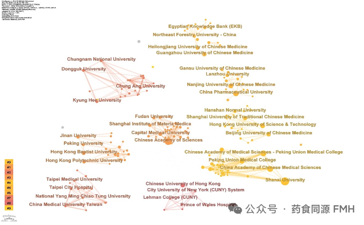 从机构共现图中,我们可以观察到N=581,E=496(密度=0.0152),表明该网络图包括 581 个机构,有 496 种合作关系,网络密度为 0.0152(图 4)。在国际院校合作网络图中,山西大学与中国科学院、中国中医科学院等高水平院校有合作关系。上海中医药大学与庆熙大学存在合作关系,但并不密切。中国机构的总体科研产出最高,各大学之间的合作频繁,但国际合作相对较少。韩国机构之间的合作主要集中在国内大学内部,很少有国际合作。因此,国际机构之间的合作并不紧密,各国主要在国内机构开展内部合作。
