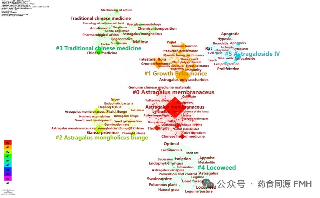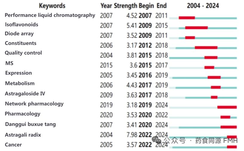 2007 年至 2015 年,国外黄芪资源研究热点主要集中在利用高效液相色谱法检测黄芪中的化学成分以及黄芪的质量控制;2016 年至 2019 年,研究热点主要集中在黄芪苷 IV 的分离与代谢;2020 年至 2024 年,研究热点转向黄芪的药理学和网络药理学,如黄芪对癌症的治疗作用。