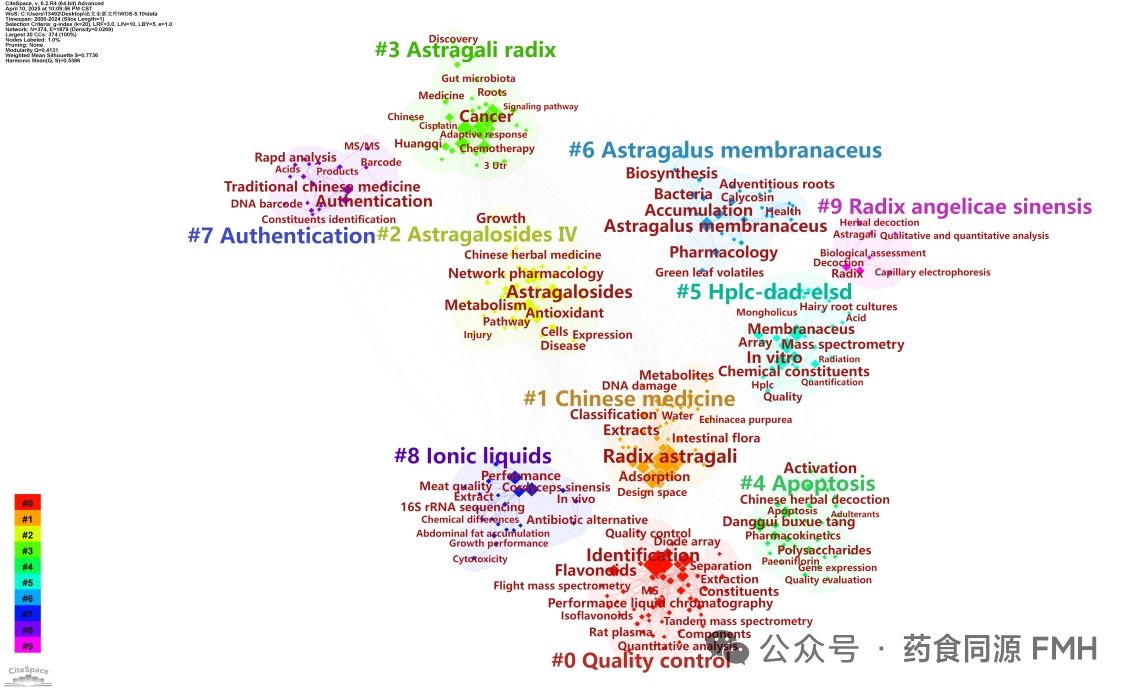 对黄芪资源国际研究领域关键词进行聚类分析(图 6),结果显示,模块度值(Q 值)为 0.422 > 0.3,剪影值(S 值)为 0.749,7 > 0.5,说明聚类结构效果显著。结果表明,国际上黄芪资源研究的主要方向为:植物资源(#1 Chinese medicine, #3 Astragali Radix, #6 Astragalus membranaceus, #9 Radix Angelicae Sinensis)、质量控制(#0 Quality control)、化学成分(#2 Astragaloside IV)、研究对象与方法(#4 Apoptosis, #5 HPLC-DAD-ELSD, #7 Authentication, #8 Ionic liquids)。
