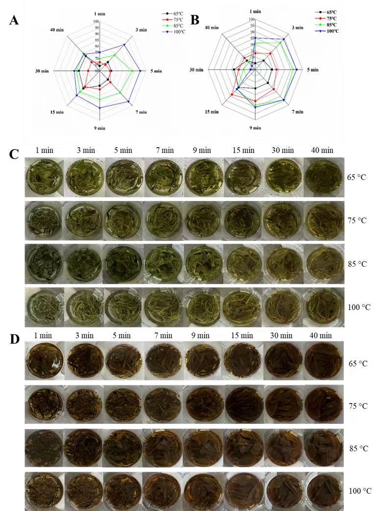 图3 富硒绿茶和红茶的感官评价雷达图以及在不同冲泡温度和时间下的外观