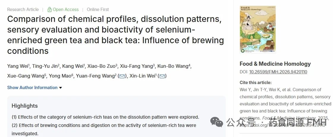 茶叶是全球第二大饮品。茶叶的健康价值源于其丰富的活性成分(如茶多酚、咖啡因、茶氨酸),具有抗氧化、调节血糖和抗菌等功能。富硒茶因硒元素的强化作用,比普通茶更具健康潜力,但硒添加与茶叶加工工艺(如绿茶未发酵、红茶全发酵)可能协同影响活性成分的浸出规律和感官品质。然而,目前对不同富硒茶的化学成分差异、冲泡条件对其成分溶出及生物活性的系统研究仍不足,消费者缺乏科学冲泡指导。上海交通大学魏新林教授团队比较富硒绿茶(SeGT)与富硒红茶(SeBT)的化学特征,明确温度、时间、次数等冲泡条件对活性成分溶出和口感的影响,并评估其模拟消化前后体外抗氧化、降血糖和抗菌活性,为消费者提供兼顾健康与风味的科学冲泡方案。