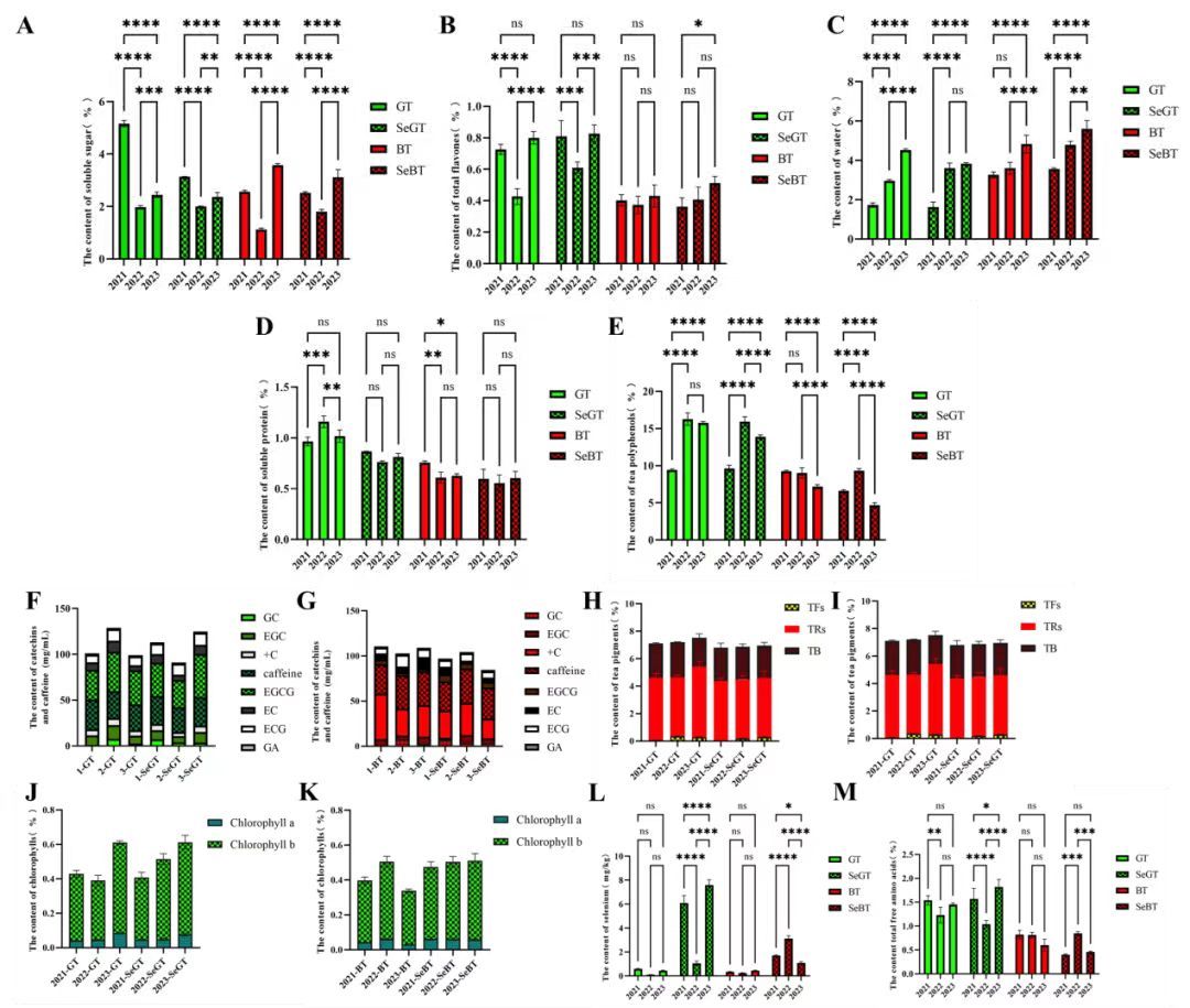 研究结果发现,富硒绿茶(SeGT)保留更多茶多酚和叶绿素,但成分易受年份影响;富硒红茶(SeBT)通过发酵生成茶黄素,咖啡因更稳定,且硒元素可能延缓类黄酮降解。红茶中茶色素(茶黄素、茶红素)总量(13-16%)显著高于绿茶(约7%)。在SeGT中,高温短时(100°C,5-7分钟)可快速释放活性成分(如茶多酚),但过久易导致茶汤苦涩;冲泡后抗氧化活性(DPPH清除率)和降血糖活性(α-淀粉酶抑制率)最强,但经体外模拟消化后活性下降。在SeBT中,成分释放缓慢且稳定,85-100°C冲泡3-7分钟时茶汤甜润适口,适合多次冲泡;消化后仍保持较高生物活性,抗菌能力(如对大肠杆菌抑制)优于绿茶。SeGT更适合追求高活性成分的消费者,但需控制冲泡时间避免苦涩味;SeBT可能凭借活性成分的稳定释放和柔和口感,受众更广。