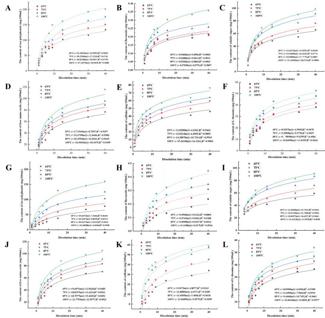 图2 不同冲泡温度和时间对富硒绿茶和红茶中主要化学成分溶解模式的影响