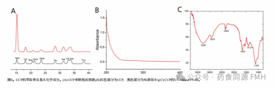 将干燥的C. chago种子(5公斤)进行水醇沉淀,随后采用Sevag法去除蛋白质,再经冷冻干燥获得31.7克,对应CCp产量约为0.59%。CCp的多糖含量测定为56%。采用内标法分析了CCp的单糖组成,结果以各单糖的质量百分比表示。如表1和图1 A所示,CCp主要由甘露糖(Man)、鼠李糖(Rha)、半乳糖A(GalA)、葡萄糖(Glc)、半乳糖(Gal)、阿拉伯糖(Ara)和岩藻糖(Fuc)组成。CCp的紫外光谱中260和280 nm处未出现吸收峰(图1 B),表明不存在游离蛋白质或核酸。在图1 C中,3283 cm−1处的强吸收峰对应于O–H伸缩振动,而2937 cm−1处的弱峰归因于C–H伸缩振动。约1602 cm−1处的峰与-CHO的剪切振动相关。此外,在约1105 cm−1处观察到一个强吸收峰,对应于C–O的弯曲振动。