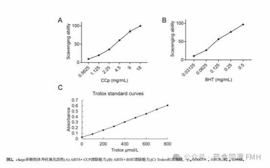 测定铁离子还原能力的原理是:在酸性条件下,样品中的还原性成分可将Fe3+-TPTZ 还原为蓝色的Fe2+- TPTZ 复合物,该复合物在593 nm处具有最大吸收峰。图2 C展示了用于比较CCp与阳性对照BHT的铁还原抗氧化能力(FRAP)的Trolox标准曲线。进一步评估显示,CCp表现出中等程度的铁离子还原能力。该物质的TEAC值为37.383 ± 2.166 μ mol/g。相比之下,阳性对照BHT显示出显著更高的TEAC值324.857 ± 31.470 μ mol/g。值得注意的是,TEAC值与铁离子还原能力呈正相关,证实了CCP相对于BHT较弱的还原能力。结合ABTS自由基清除结果,这些发现表明CCp通过与自由基相互作用有效终止自由基链反应,证明其在体外具有明确的抗氧化活性。
