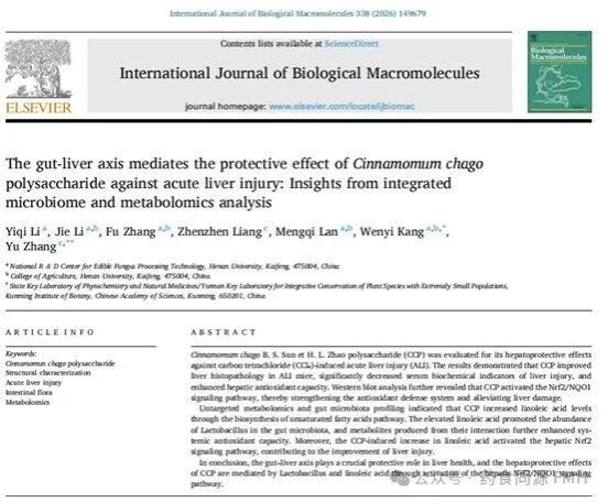 总之,CCp在体外表现出显著的抗氧化活性,并能有效缓解 CCl 4诱导的小鼠急性肝损伤。这种保护作用与肝脏抗氧化能力增强及Nrf2/NQO1信号通路的激活有关。此外,CCp干预可调节肠道菌群组成并提高肠道亚油酸水平。这些发现表明,CCp的肝保护作用可能是通过肠-肝轴介导的,这为植物多糖发挥对化学诱导肝损伤保护作用的机制提供了新的见解。