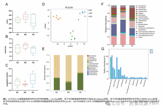 多项研究表明,肝损伤与肠道菌群失衡密切相关。为评估为研究三个实验组肠道微生物群落的多样性、丰度和组成,进行了16SrDNA测序。如图5 A-D所示,MC组肠道微生物群的丰富度(Chao指数)和多样性(Shannon指数)均有所增加,而CCp给药后这些变化被逆转。相比之下,HD组表现出下降趋势,这与先前的研究结果一致。为了进一步突出样本间的差异,我们进行了 β 多样性分析。图5 D展示了MC组和HD组之间肠道微生物群组成存在显著差异。偏最小二乘判别分析(PLSDA)揭示了样本间的结构变异。暴露于四氯化碳后,MC组与BC组明显分离,表明四氯化碳显著改变了肠道微生物群落。接受高剂量CCp处理的小鼠肠道微生物群与MC组明显分离,提示CCp可缓解四氯化碳引起的肠道微生物群紊乱。这些结果表明,CCp能有效恢复四氯化碳破坏的肠道微生物结构。为进一步研究CCp对急性肝损伤小鼠微生物群落的影响,分析了BC、MC和HD组在门水平上的微生物组成。