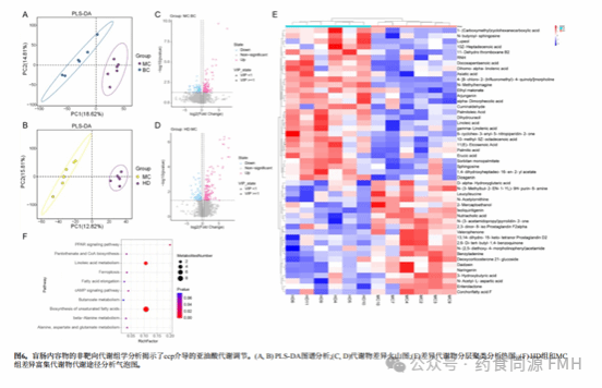 根据VIP≥1、倍数变化≥1.2或≤0.83、p<0.05的标准筛选组间潜在差异代谢物,并采用火山图进行结果可视化。如图6(C、D)所示,与BC组相比,MC组表现出123种上调代谢物和75种下调代谢物。相反,与MC组相比,HD组显示134种上调代谢物和68种下调代谢物。采用聚类分析比较MC组与HD组之间的差异代谢物。热图中每行代表一种差异代谢物,每列代表一个样本,颜色强度反映代谢物表达水平。