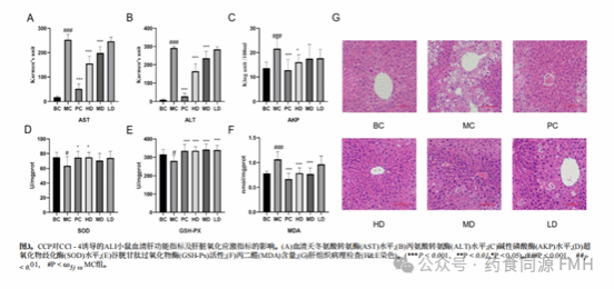 在图3 G中,空白组的肝组织切片显示正常形态,具有清晰的细胞核、可见的中央静脉、完整的肝窦、径向排列的肝细胞以及保存良好的肝索。相比之下,模型组的肝细胞体积增大且排列不规则,表现出结构紊乱、核萎缩、广泛坏死和显著的空泡化。使用CCp或联苯双酯治疗显著减轻了肝损伤,部分肝组织的细胞结构得以恢复,整体结构更接近健康肝组织。这些发现表明,CCp和联苯双酯对小鼠CCl4诱导的肝损伤均具有保护作用。