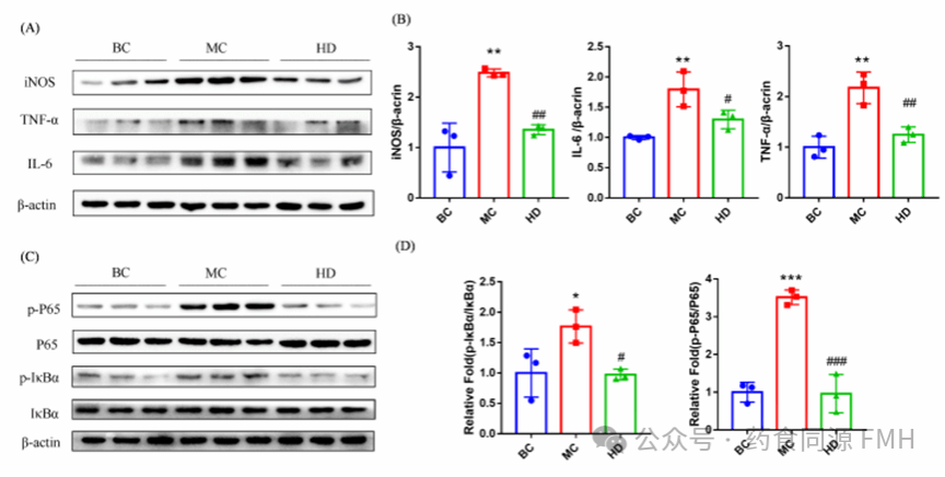 在给予AMDF后,IL-6和 TNF-α的蛋白表达水平显著降低。同时发现给予AMDF后,iNOS 的蛋白表达水平(P < 0.01)显著降低,P65的磷酸化水平(P < 0.001)和IκB-α 的磷酸化水平(P < 0.05)显著降低。表明,AMDF能够抑制NF-κB信号通路,并抑制炎症因子的表达,从而减轻FC大鼠的肠道炎症。