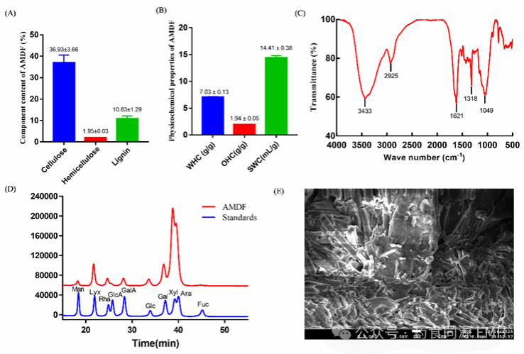 Fig. 1. Component determination and physicochemical property analysis of AMDF Physical properties of AMDF (A). The basic components of SDF (B). Infrared spectrogram of AMDF (C). Monosaccharide composition of AMDF (D). SEM image of AMDF (5000×) (E).