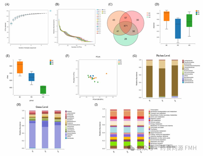 Fig. 5. Effects of AMDF on intestinal microbiota Species accumulation curves(A); Rank-abundance curve of intestinal microbiota (B); Venn diagram (C); α diversity group difference plot (D-E); PCA (F); Relative abundance of dominant microbiota at phylum level and genus level (G-H); KEGG function prediction of intestinal microbiota (I).