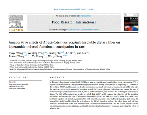 该成果以“Ameliorative effects of Atractylodes macrocephala insoluble dietary fiber on loperamide-induced functional constipation in rats”为题发表于中科院TOP1区期刊Food Research International杂志(IF 8.0)。