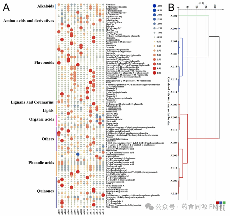 本研究通过代谢组学方法,全面分析了15种典型药用芦荟的代谢成分,揭示了芦荟物种的代谢多样性,并明确了不同物种间的化学差异及关键代谢通路。此外,还鉴定了一些潜在的化学分类标记物。本研究为芦荟在医药、化妆品和食品行业的应用提供了重要的研究基础。