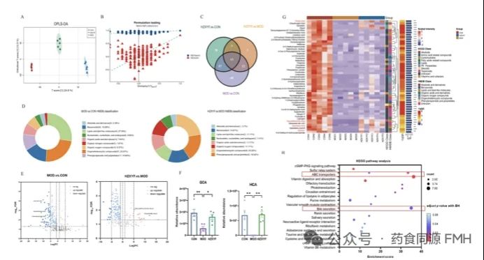 代谢组学揭示泽泻饮的调控,泽泻饮减少促炎次级胆汁酸(如DCA、LCA),促进胆固醇转化为胆汁酸排泄,激活FXR信号通路,实现“降脂护肠”双向和谐。