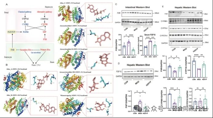 分子对接与关键靶点验证揭秘关键通路:通过调节肠道菌群→减少次级胆汁酸→抑制FXR/FGF15信号→激活肝脏CYP7A1酶,促进胆固醇代谢。