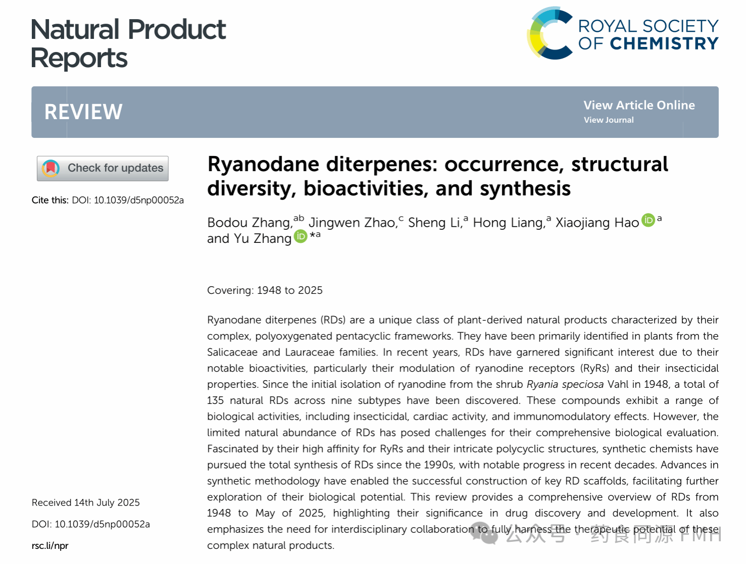 Ryanodane二萜(瑞诺烷二萜,RDs)是一类结构独特的植物源性天然产物,其特征是拥有复杂、多氧代的多环骨架。它们主要分布于樟科(Salicaceae)和杨柳科(Lauraceae)植物中。近年来,RDs因其显著的生物活性而备受关注,特别是其对兰尼碱受体(RyRs)的调控作用及杀虫特性。自1948年首次从灌木Ryania speciosa Vahl中分离得到ryanodine以来,目前已发现涵盖9种亚型、共计135个天然RDs。这些化合物展现出包括杀虫、心脏活性及免疫调节作用在内的多种生物活性。然而,RDs在自然界中的有限丰度为其全面的生物学评价带来了挑战。受其与RyRs的高亲和力及其复杂的多环结构吸引,合成化学家自20世纪90年代起便致力于RDs的全合成研究,并在近几十年来取得了显著进展。合成方法学的进步使得成功构建关键的RDs骨架成为可能,从而促进了对其生物学潜力的进一步探索。本综述全面概述了从1948年至2025年5月期间的RDs研究,重点阐述了它们在药物发现与开发中的重要性,并强调了跨学科合作对于充分挖掘这些复杂天然产物治疗潜力的必要性。
