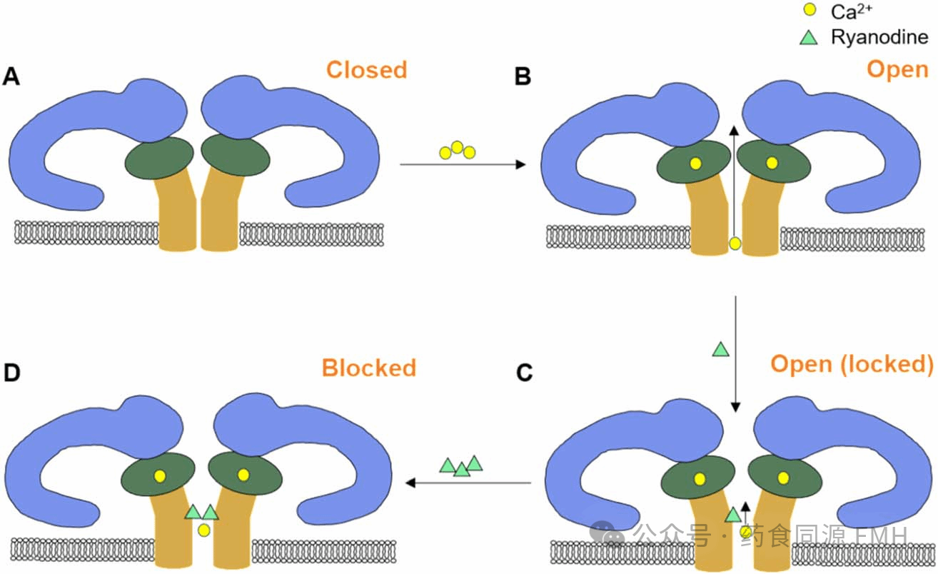 图3. RyR1的激活与孔道开放示意图,展示了Ryanodine的结合及其诱导的亚电导状态