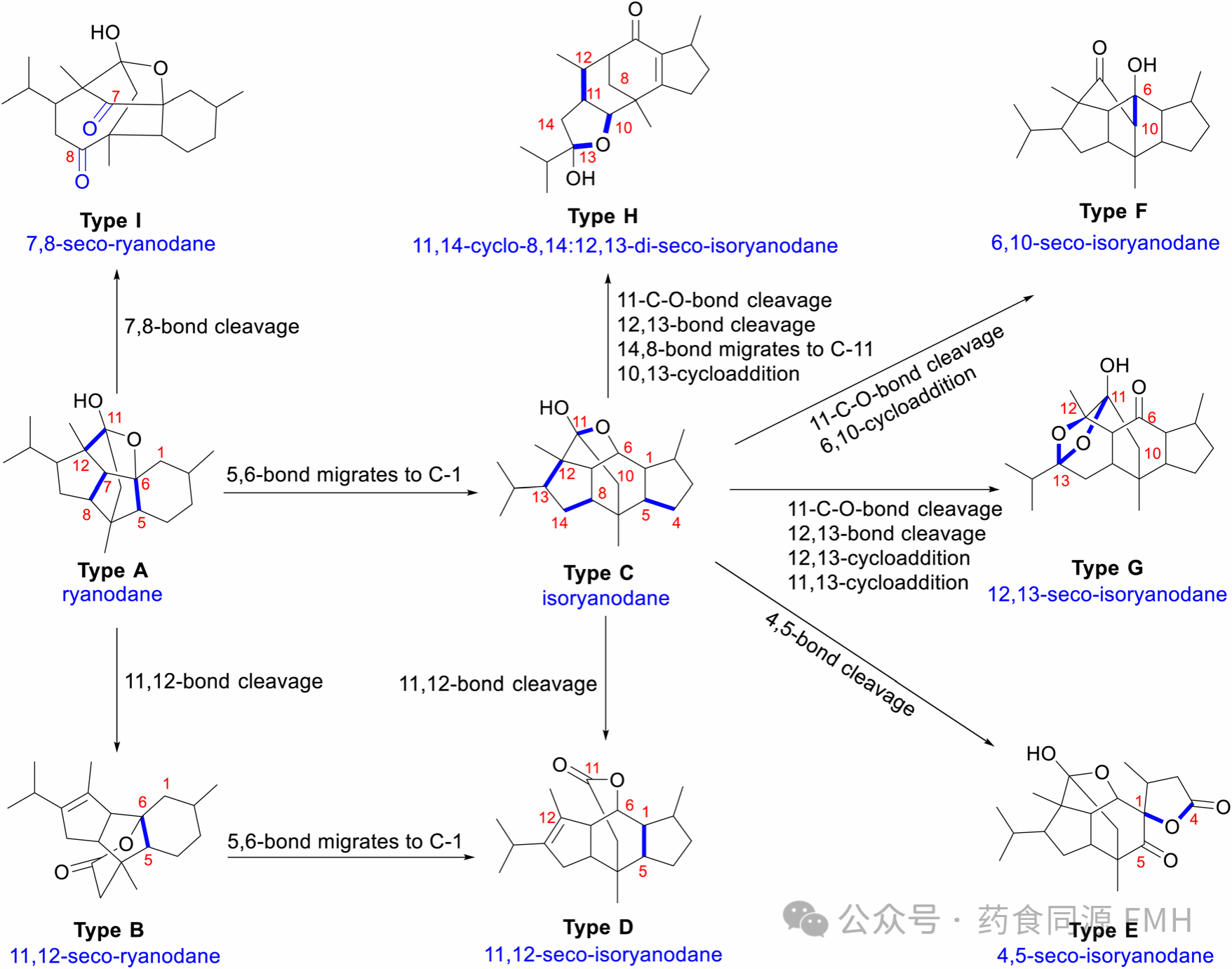 从结构上看,RDs以其复杂的多环笼状骨架、连续的立体中心(特别是多个季碳中心)和高度氧化的特征而闻名。基于核心骨架的环系连接方式及生物合成关系,可将其系统性地划分为三大类核心骨架,并进一步细分为九个亚型(A-I)(图2)。这些复杂的骨架可以通过假想的生物合成转化相互关联(Scheme 1)。