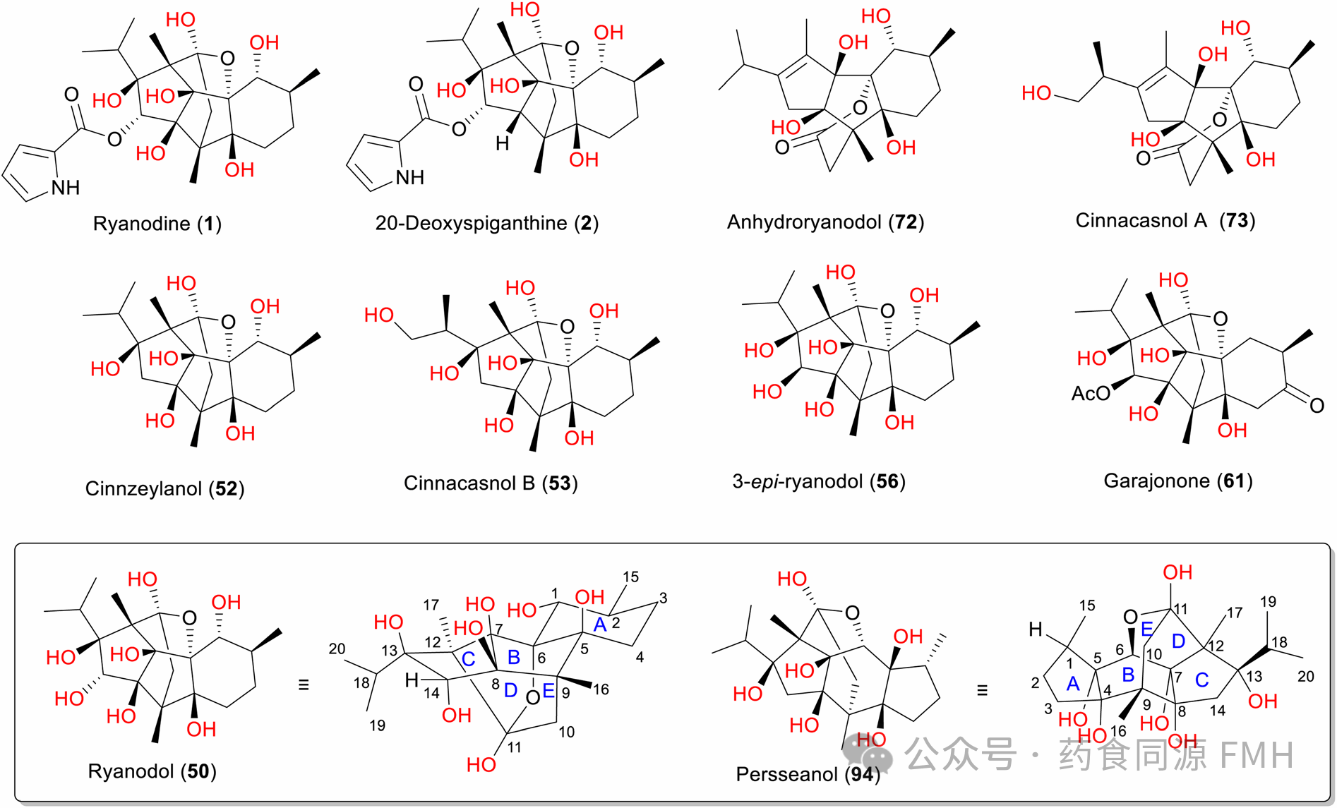 樟科是RDs最丰富的来源,贡献了总数48.1%(65个)的化合物,主要集中在以下三个属种:中国肉桂(Cinnamomum cassia)作为RD研究的模式物种之一,其树皮和叶片是RD的结构宝库,单独贡献了52个RDs,占总数的38.5%。该物种产生的RDs以非生物碱型为主,结构亚型覆盖A, B, C, D, G, H等,展现出惊人的氧化修饰和骨架重排能力。尽管在传统医药(如阿育吠陀)中,斯里兰卡肉桂(Cinnamomum zeylanicum)地位显著,但目前仅从中分离到2个RDs,暗示其可能存在未被充分挖掘的化学多样性或较低的生物合成能力。印度鳄梨(Persea indica),这种分布于西班牙加那利群岛的乔木是另一个RDs的重要已知来源,共已发现22个RDs。其植物体内高含量的RDs被证实是有效的广谱昆虫防御毒素,对斜纹夜蛾等重要农业害虫表现出强烈毒杀活性。樟科植物,特别是Cinnamomum属和Persea属,可被视为RDs生物合成的“进化热点”。这种分布模式与二萜类化合物在热带生态系统中抵御植食性昆虫和病原菌压力的功能相吻合。值得注意的是,化合物ryanodine (1) 是P. indica, R. speciosa 和 S. anthelmia这三个不同科物种的共享代谢物。这种跨分类学的趋同现象,可能反映了热带森林中植物为应对相似的植食压力而发生的适应性基因招募事件。