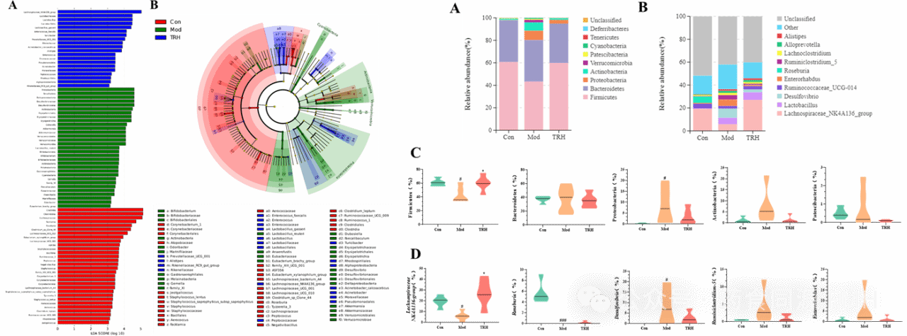 本研究经分析各组属水平的肠道菌群差异,发现各组肠道菌群的群落结构不同。正常组有32个特有物种,模型组和给药组分别有31个和30个。具体而言,正常组中存在Lachnospiraceae NK4A136_group、Lactobacillus、Enterococcus gasser及Turicibacter等物种;而模型组则包含Proteobacteria、Desulfovibrio、放线菌及Deltaproteobacteria等特有物种,三叶苷组中的差异物种则包括Clostridiales、Lachnospiraceae、Facklamia及Roseburia等。接着,通过16S rRNA基因测序分析小鼠肠道微生物群生态结构。门水平上,厚壁菌门和拟杆菌门占主导。急性酒精刺激后,模型组Proteobacteria、Patescibacteria、拟杆菌及放线菌数量显著增加,厚壁菌门减少。属水平上,Lachnospiraceae NK4A136与Desulfovibrio占多数。模型组Enterorhabdus、Desulfovibrio和Ruminiclostridium-5的水平增加,而Lachnospiraceae NK4A136与Roseburia的数量则减少。然而,在给予三叶苷后,这些趋势得到了逆转,这些结果表明三叶苷有助于恢复酒精导致的肠道菌群紊乱。