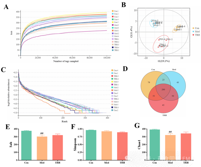 本研究进一步采用16S rRNA高通量测序技术分析了肠道菌群的变化情况。物种的均匀度和丰富度通常可以评估测序中的物种多样性。随着测序深度的增加,每个样品的稀释曲线逐渐趋于平稳,这表明测序深度已达到饱和、测序量是足够的。在α-多样性评估中,模型组的多样性指数显著低于正常组,显示肠道微生物群出现失衡。而给予三叶苷后,各指数均有所回升,表明其具备恢复肠道微生物多样性的潜力。OUT-PLS-DA分析显示,正常组和模型组之间存在明显差异,而三叶苷组则明显趋近于正常组。整体结果表明,肠道微生物群的失调在给予三叶苷后得以部分逆转,说明了甜茶及三叶苷在减轻酒精性肝损伤及改善肠道健康方面的潜力。