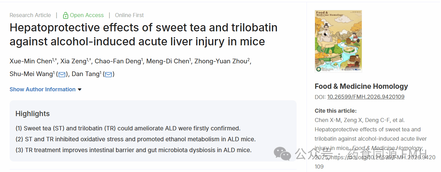 本研究证实了甜茶及其主要活性成分三叶苷能够有效抑制肝脏氧化应激,促进乙醇代谢,进而改善酒精性肝损伤。其解酒护肝的作用机制可能与甜茶中的三叶苷调节肠道菌群稳态、改善肠道屏障功能,并通过“肠-肝轴”发挥功效密切相关。本研究成果为甜茶这一特色药食两用资源的进一步深入研究及高值化综合开发利用提供了科学依据,也为开发新型解酒护肝功能食品奠定了基础。