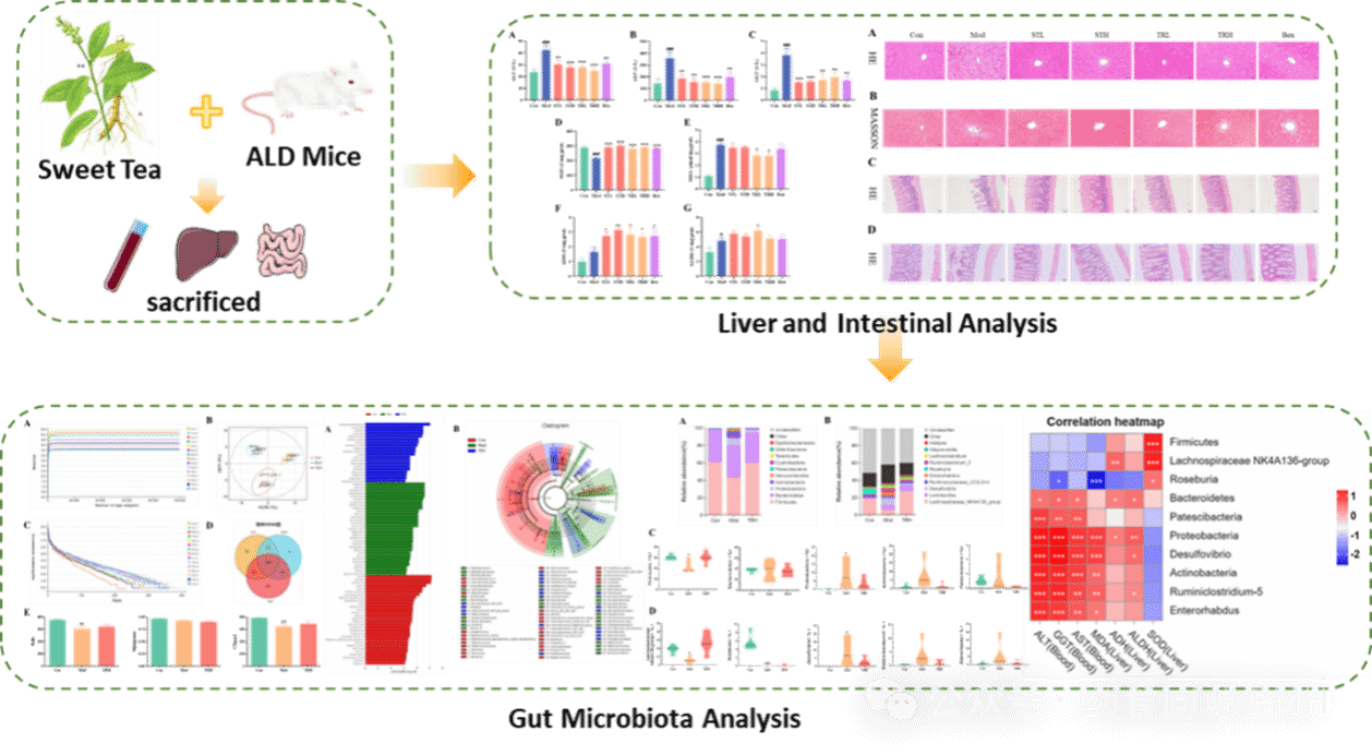 广东药科大学汤丹副研究员课题组对甜茶开展了系列研究,经系统综述发现甜茶及其主要成分三叶苷具有调节糖脂代谢、抗炎、抗衰老与抗氧化应激、神经保护等系列药理作用,同时前期研究发现甜茶三叶苷可通过抑制NLRP3炎症小体激活缓解炎症和细胞焦亡,从而改善糖尿病合并非酒精性脂肪肝。然而,甜茶及三叶苷能否改善酒精性肝损伤及其作用机制目前仍有待进一步研究。本研究通过构建急性酒精性肝损伤动物模型并结合16S rRNA高通量测序等技术,对甜茶及其主要成分三叶苷的解酒保肝功效作用和作用机制开展了研究。