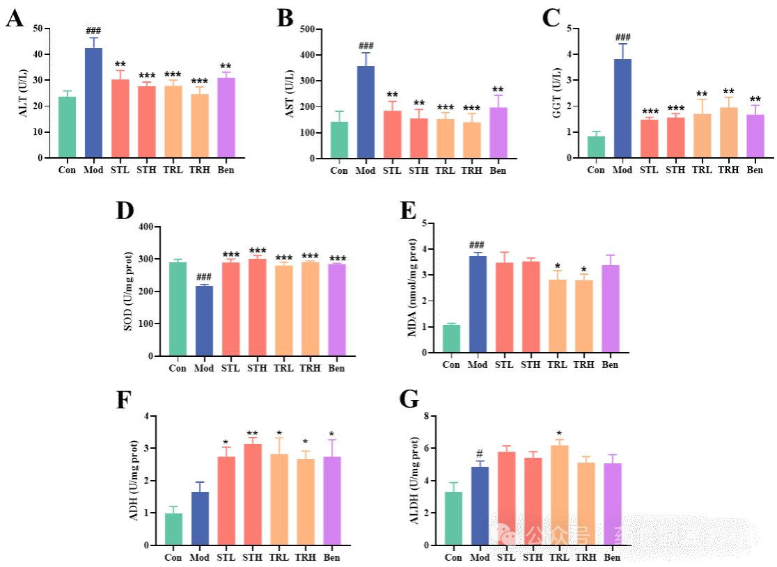 本研究首先探讨了甜茶及其主成分三叶苷改善酒精性肝损伤的药效作用。研究发现酒精暴露会致小鼠肝脏受损,血浆酒精浓度上升。模型组小鼠ALT、AST、GGT水平较正常组显著升高,甜茶和三叶苷高低剂量组小鼠血浆中这些指标显著下降,表明二者能抑制ALD小鼠肝功能恶化。在肝脏抗氧化能力方面,与正常组相比,模型组小鼠MDA水平显著升高、SOD水平显著下降。三叶苷干预使SOD水平上升、MDA水平下降,甜茶干预显著提高SOD水平,但对MDA无显著影响,显示二者能逆转肝脏氧化应激损伤。此外,甜茶和三叶苷显著提高肝脏乙醇脱氢酶(ADH)和乙醛脱氢酶(ALDH)的水平,有效促进体内乙醇代谢。