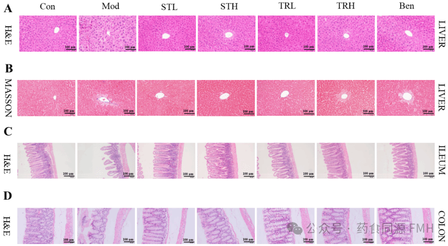 组织病理学H&E及Masson染色结果显示,正常组小鼠肝组织结构完好,而酒精损伤的模型组出现肝索紊乱、肝细胞肿胀、炎症浸润及部分纤维化。经给予甜茶和三叶苷后,肝脏病理变化显著改善,表明二者对ALD效果显著。回肠及结肠标本的H&E染色显示,正常组肠道结构正常,模型组小鼠回肠绒毛杂乱、缩短、脱落,结肠隐窝受损、绒毛变短不规则。经甜茶和三叶苷干预,各剂量组小鼠肠道损伤和水肿明显缓解,细胞结构排列有序,证实二者能有效缓解酒精引起的肠道损伤,恢复肠道完整性。