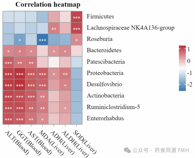 为了进一步探究肠道菌群与ALD之间的相关性,采用Pearson相关系数进行了相关性分析,并通过相关热图进行可视化展示。在热图中,颜色越趋于红色,表明两个因素之间的正相关性越强,而蓝色则表示相反情况。如图6所示,肠道菌群与酒精性肝损伤指标之间呈现出显著的相关性,ALD小鼠肠道菌群的失衡会影响肝损伤、抗氧化以及酒精代谢相关因子的释放,进而影响ALD的进程。