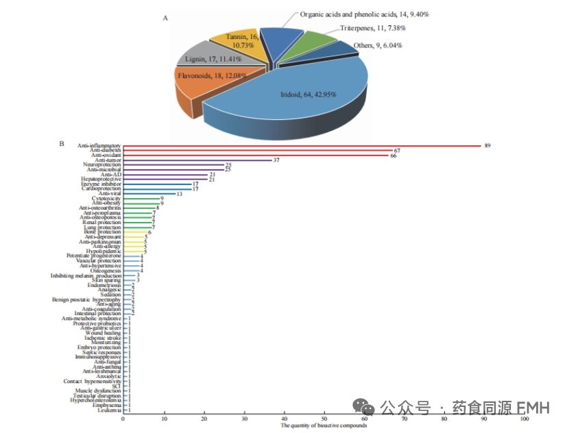 国家食用菌加工技术研发专业中心马常阳研究员团队总结了近五年来山茱萸的活性成分、药理作用及分子机制,以期为山茱萸的开发和利用提供参考。共总结出山茱萸的 149 种活性成分,包括环烯醚萜类(64 种)、黄酮类(18 种)、木脂素类(17 种)、鞣质类(16 种)、有机酸和酚酸类(14 种)、三萜类(11 种)及其他类(9 种),并根据其药理作用进一步细分。