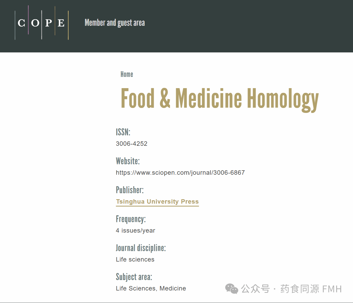 近悉,Food & Medicine Homology 通过了国际出版伦理委员会(COPE)的严格评审,正式成为COPE成员期刊。标志着期刊在学术出版规范、透明度、伦理和诚信建设等方面达到国际学术出版最佳实践要求,为国际学术出版界所认可。