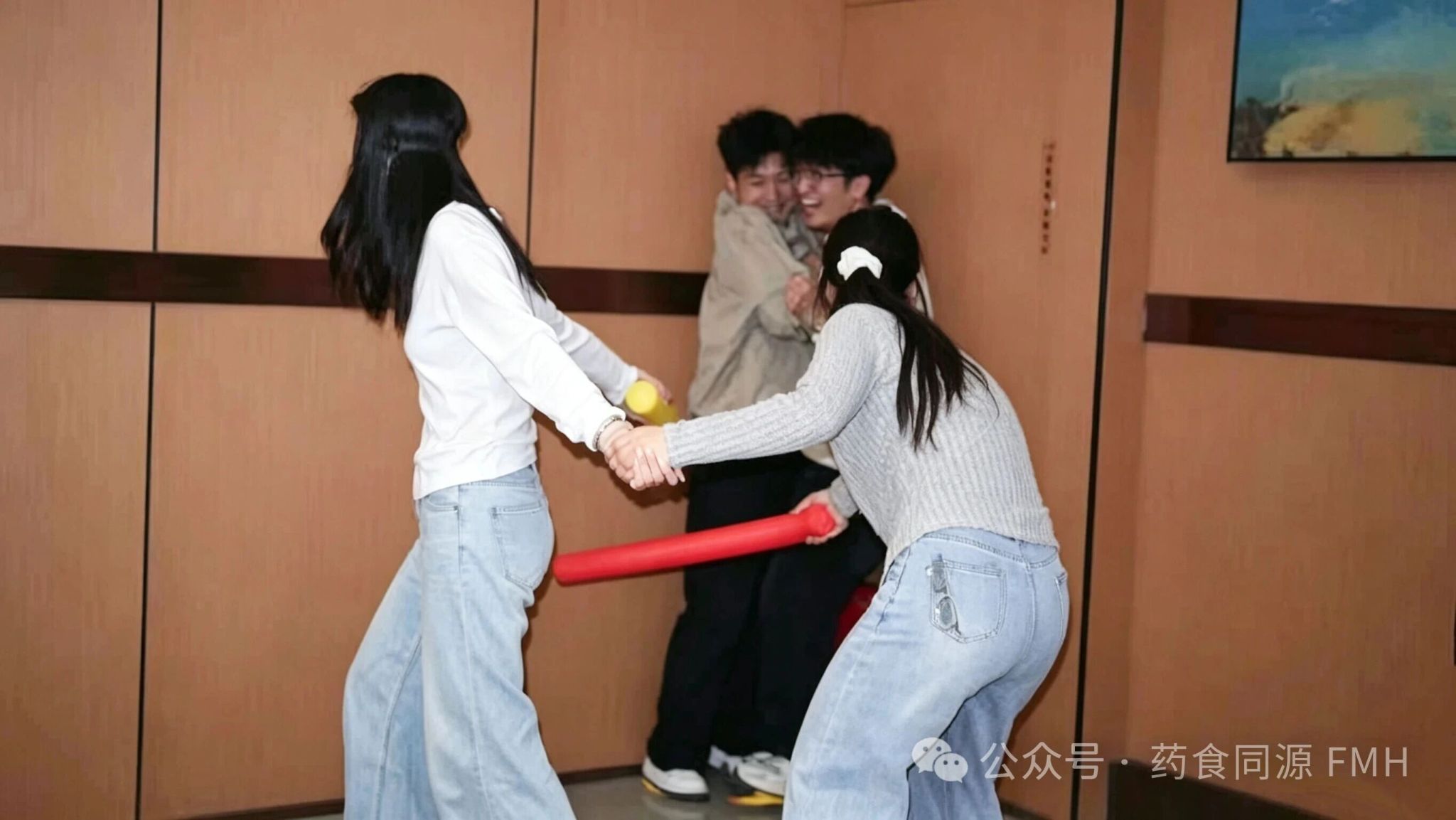 蒙眼互打项目中,参赛选手蒙住双眼,手持海绵条,在队友的指引下寻找目标、精准出击。现场笑声不断、热闹非凡,同学们在趣味对抗中卸下压力,尽情享受游戏的快乐,也在默契配合中增进了彼此的情谊。