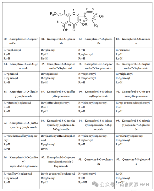 现代研究表明芜菁中含有黄酮类、硫代葡萄糖苷类、多糖类、有机酸类等多种类型的化学成分。当前研究发现芜菁所含的第一大类成分为黄酮类化合物,主要以槲皮素、山柰酚、异鼠李素为主。多糖作为一种广泛存在的天然高分子化合物,在芜菁中可表现为显著的抗癌活性等,其作为芜菁主要活性成分之一,质量分数约为9.8%~10.5%。