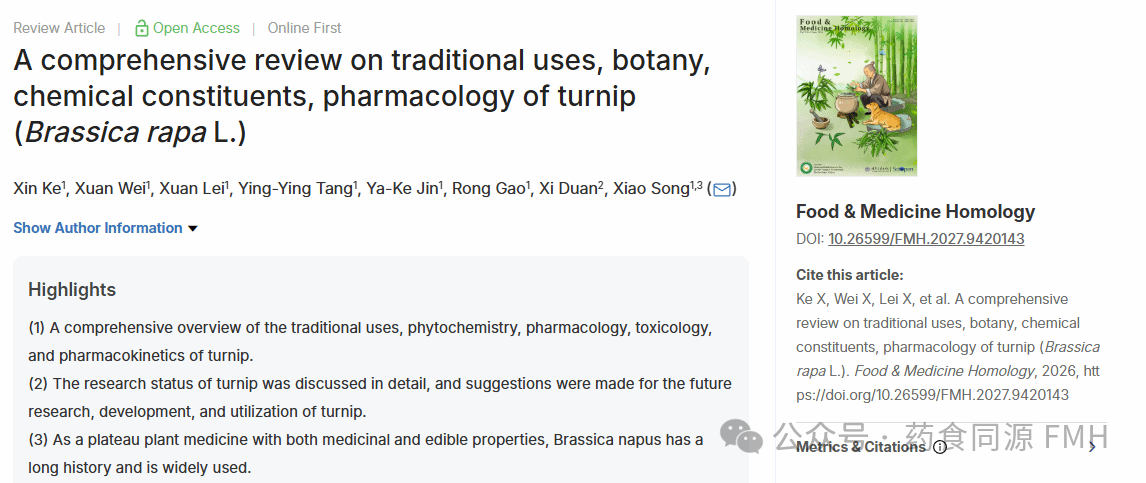 本文对芜菁的传统用途、植物学、植物化学、药理学等相关内容进行了综述,共汇总了芜菁的113种成分,阐述了芜菁在抗癌、抗缺氧、抗氧化、降血糖、神经保护、免疫调节、抗炎抑菌以及促进骨生长等方面的作用。近年来芜菁的研究主要集中在其农业种植方面,例如杂交育种、防病虫害、提高产量等,而药用研究并不充分,其基础研究如化学成分的提取分离等仍然尚在探索。随着消费者对健康重视程度的提升,他们更倾向于选择有健康益处的天然活性成分,现代医学也同样致力于寻找这种成分,而芜菁作为历史悠久的药食两用药材,具有巨大的潜力,未来可在药品、辅助治疗用药以及功能性食品开发等方面有所创新。